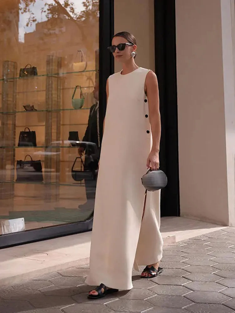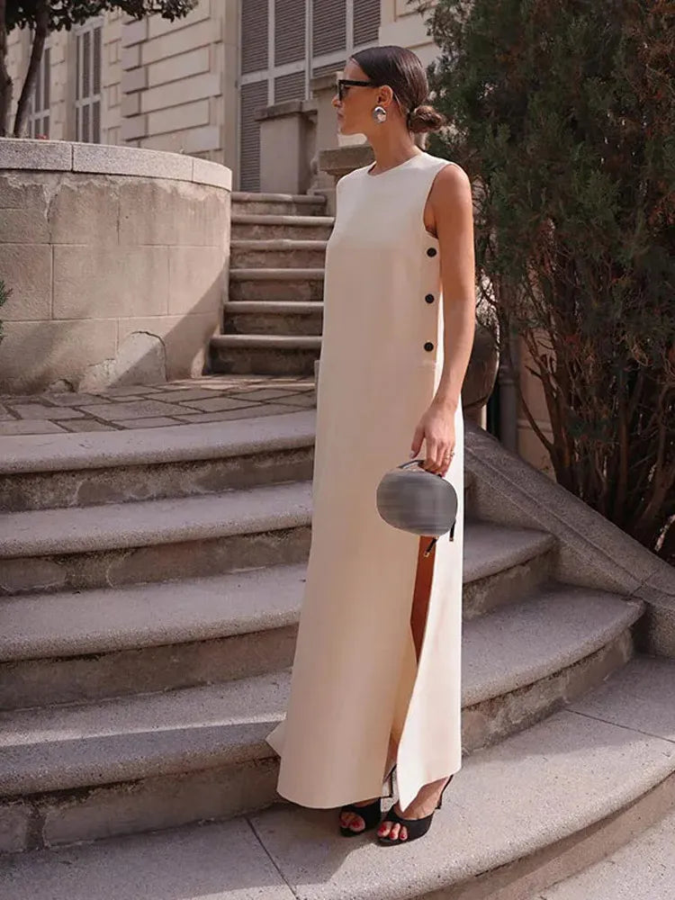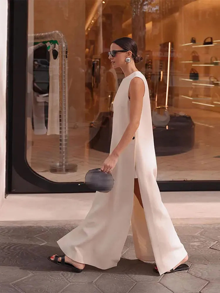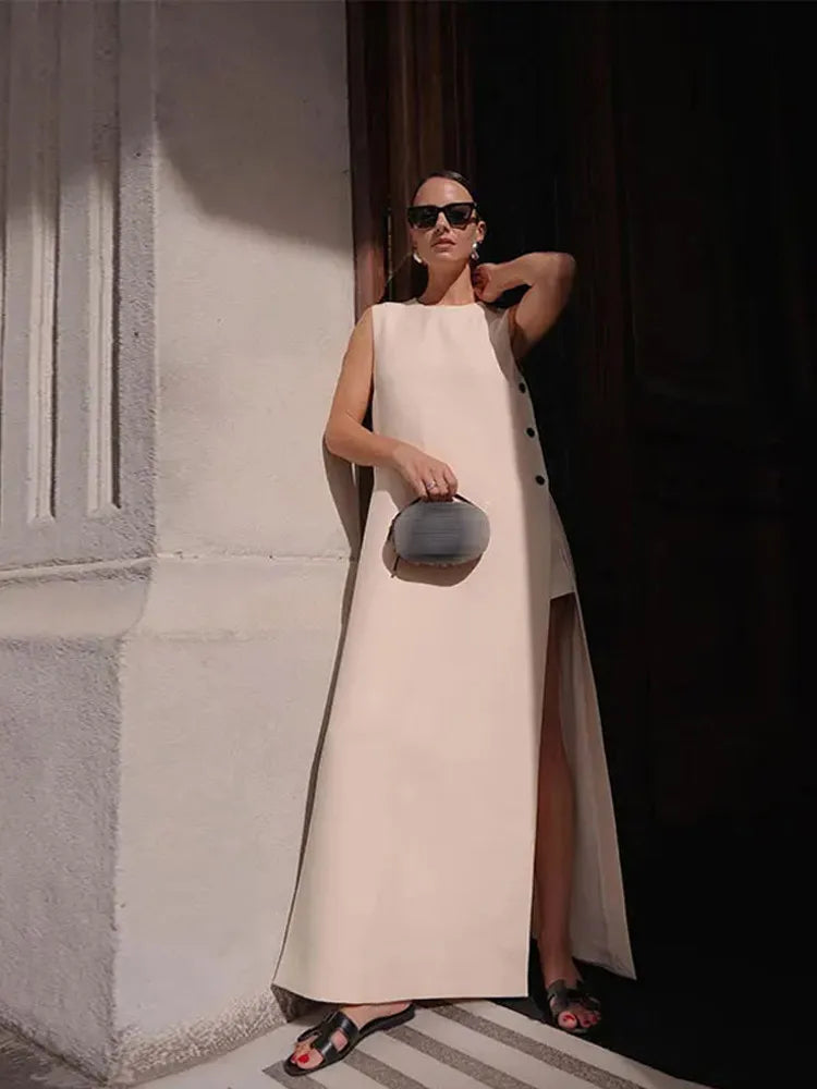 Step into elegance with Ava, our chic Pink Midi Dress, designed for effortless sophistication. This stunning sleeveless dress features graceful side splits and a loose fit, offering both comfort and style. The soft pink hue adds a touch of femininity, making it perfect for any occasion, from daytime outings to evening events.