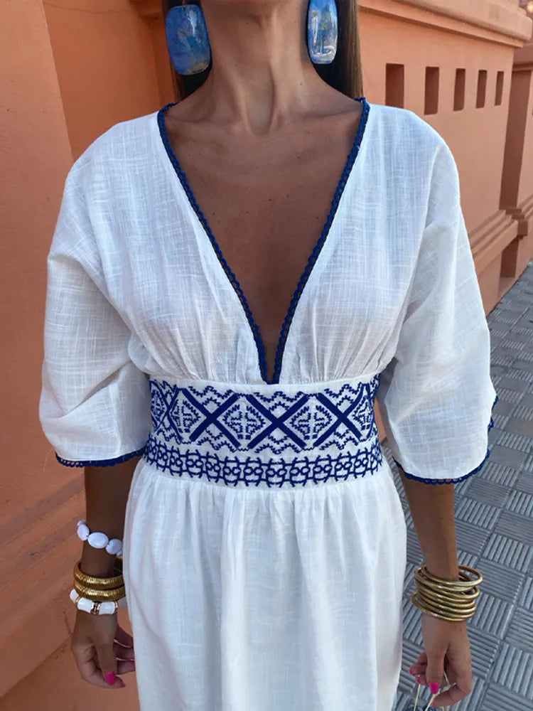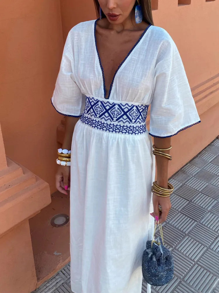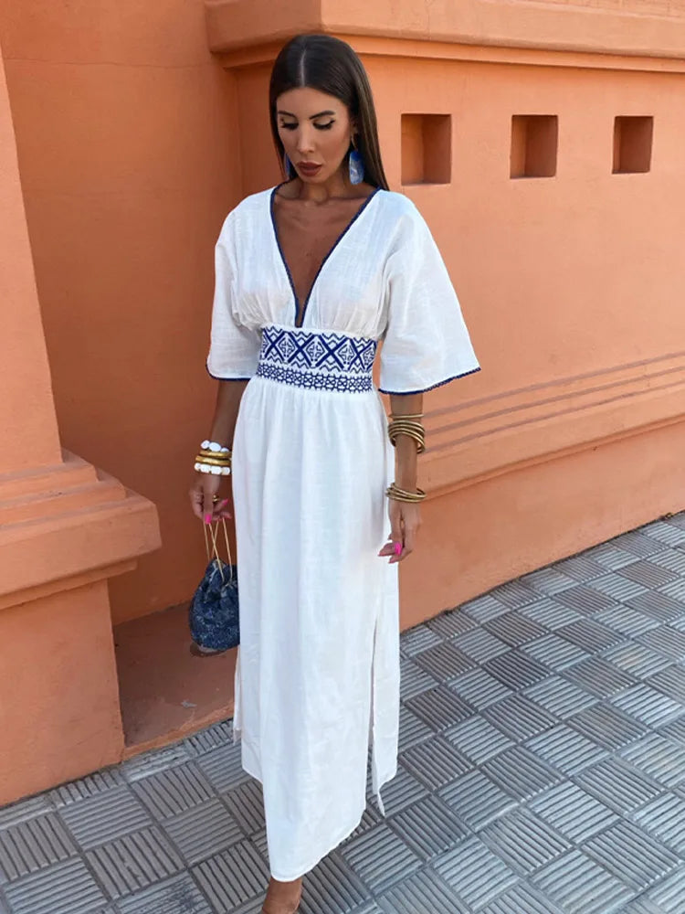 Step into summer elegance with Maya, our White Maxi Dress, featuring a delicate embroidery at the waist that adds a touch of artisanal charm. This breezy dress boasts a deep V-neck and short sleeves, perfect for warm, sunny days.