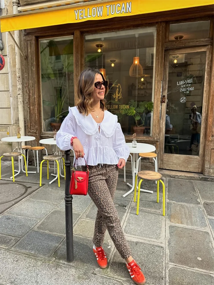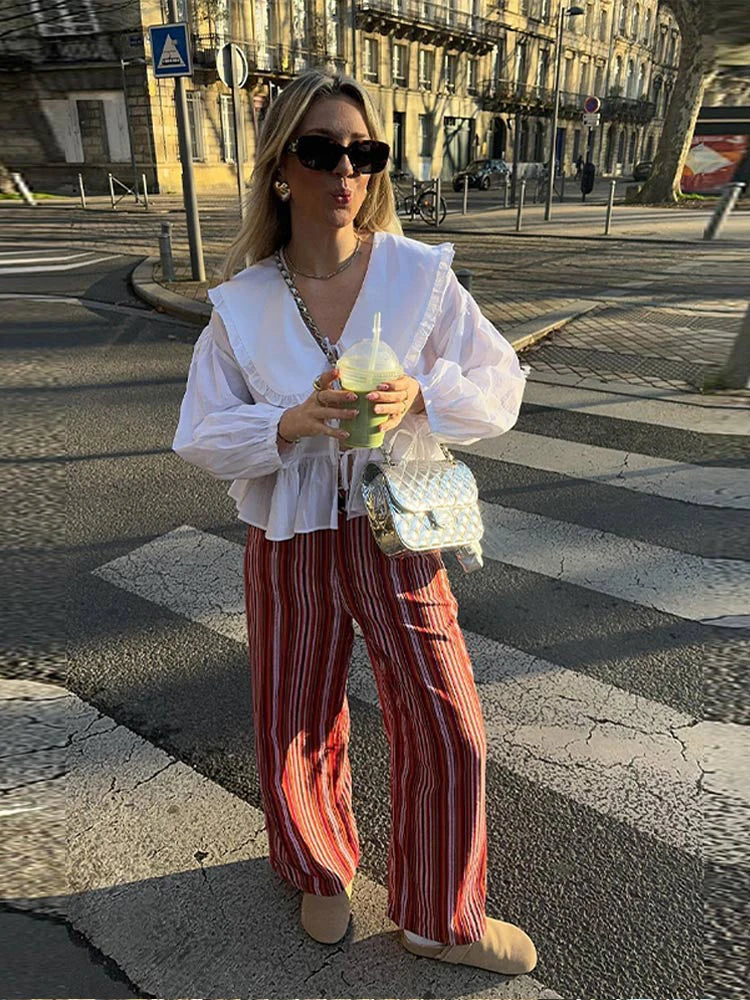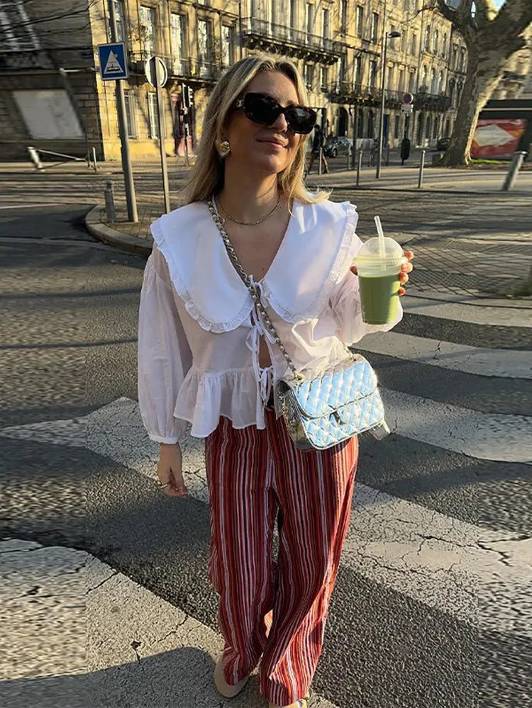 Discover the enchanting charm of Angela, a delightful creation that blends timeless elegance with a touch of whimsy. This shirt showcases an exaggerated Peter Pan collar, offering a bold and stylish statement that captures the eye.