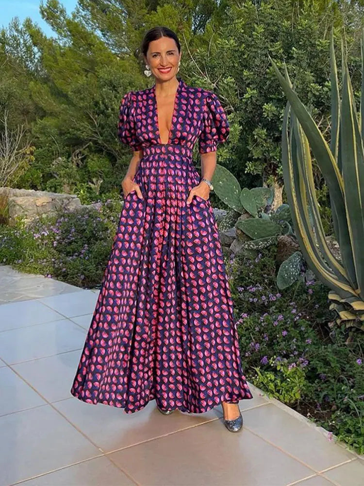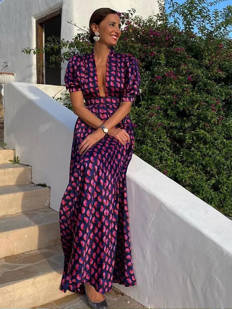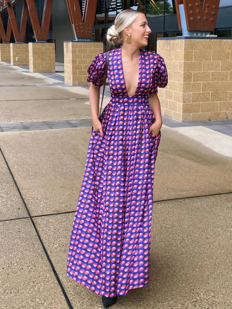 Unveil elegance with, Ella, our Purple Maxi Dress, showcasing a striking geometric print that exudes contemporary charm. This sophisticated dress features a deep V-neck and short puff sleeves, adding a touch of drama to its refined silhouette. Practical pockets blend seamlessly with its stylish design, offering both convenience and flair. Perfect for any elegant occasion.