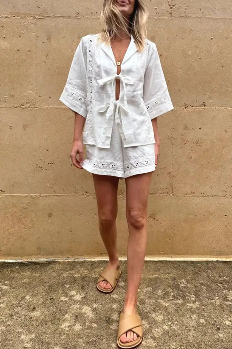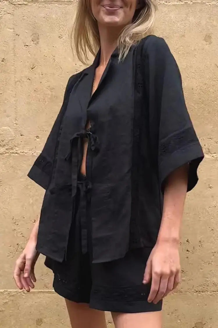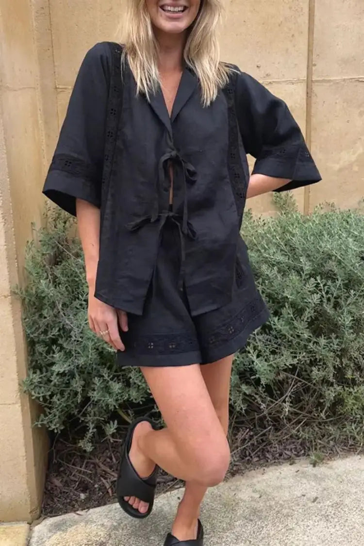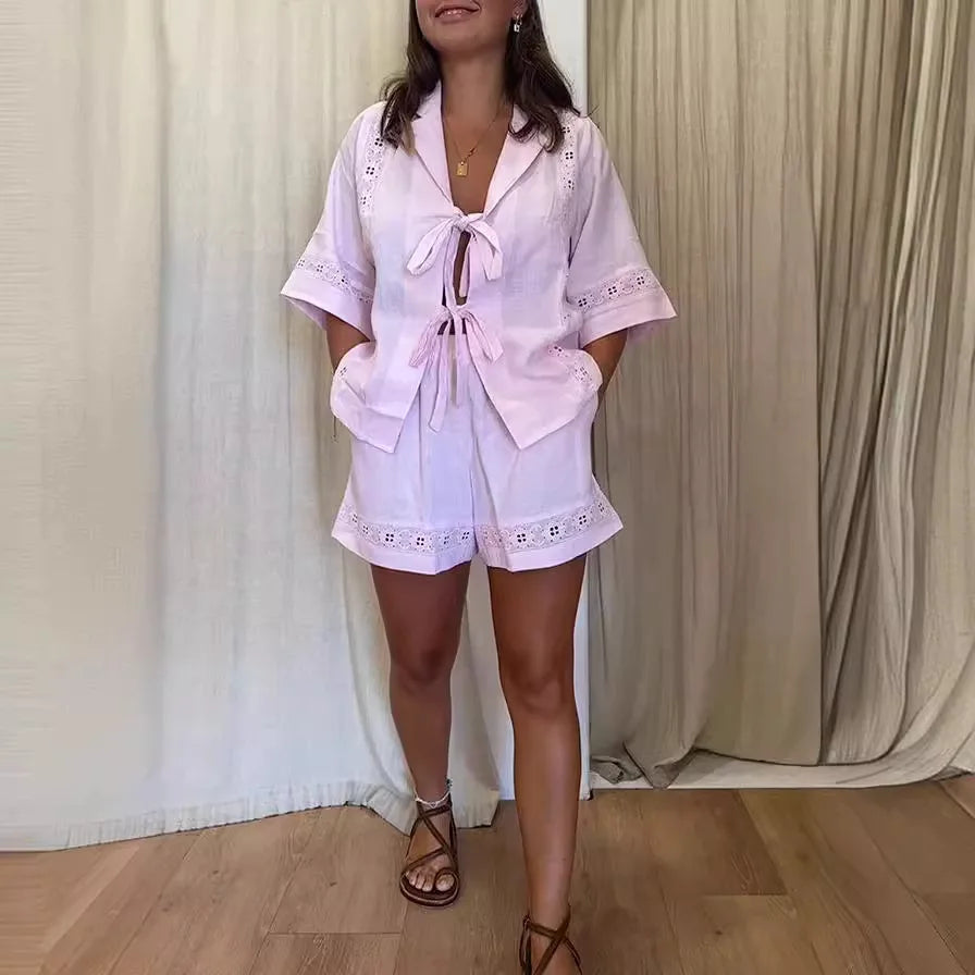 Discove Ilyana, our shirt & shorts set in this beautiful pink and red geometric print.