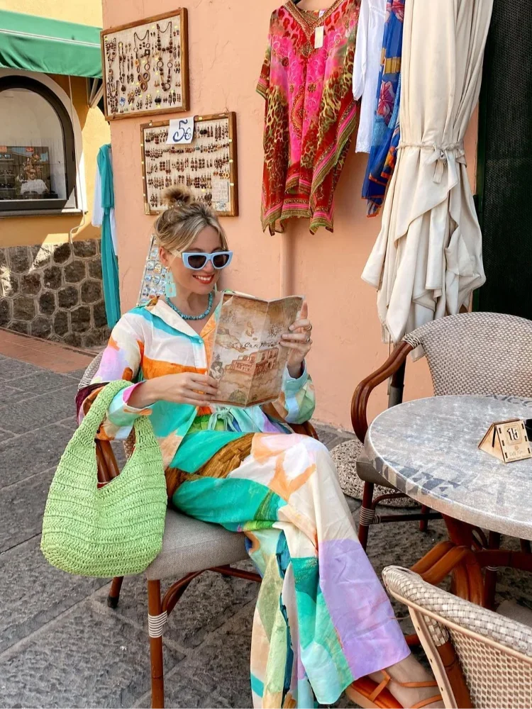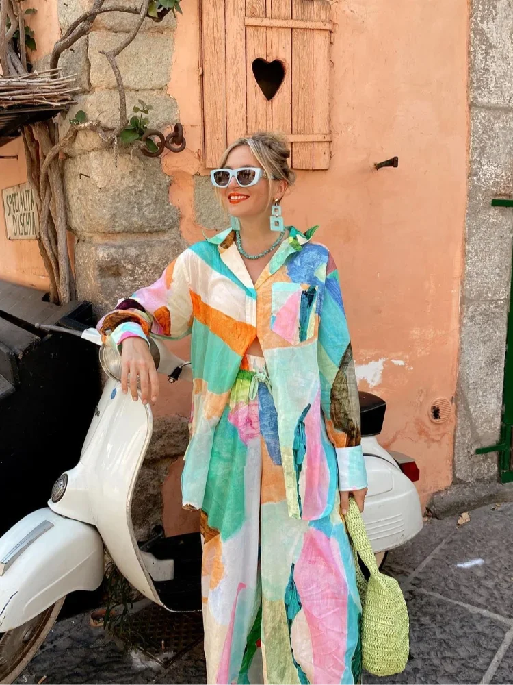 Step into summer with Tara, our vibrant 2-Piece Set, featuring a mix of cheerful summer colors. This stylish ensemble includes a breezy long-sleeved shirt and wide-leg pants, offering a perfect blend of comfort and elegance.